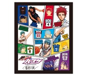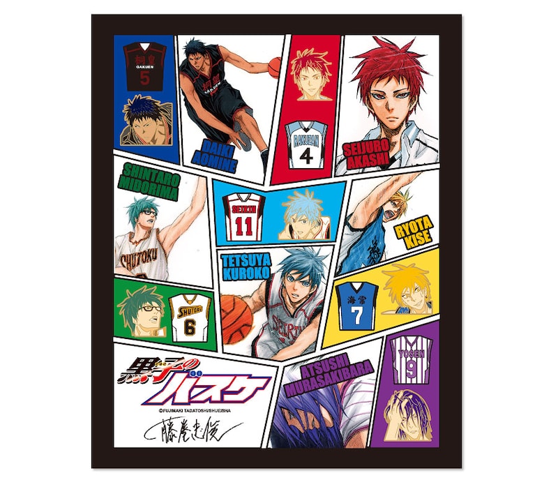主人公の黒子テツヤをはじめ、黄瀬涼太、緑間真太郎、青峰大輝、紫原敦、赤司征十郎といった「キセキの世代」6人のキャラクターピンズと、彼らのユニフォーム6種がセットになったこの商品。ピンズがセットされる台紙には、6人のイラストと、藤巻のサインがプリントされている。