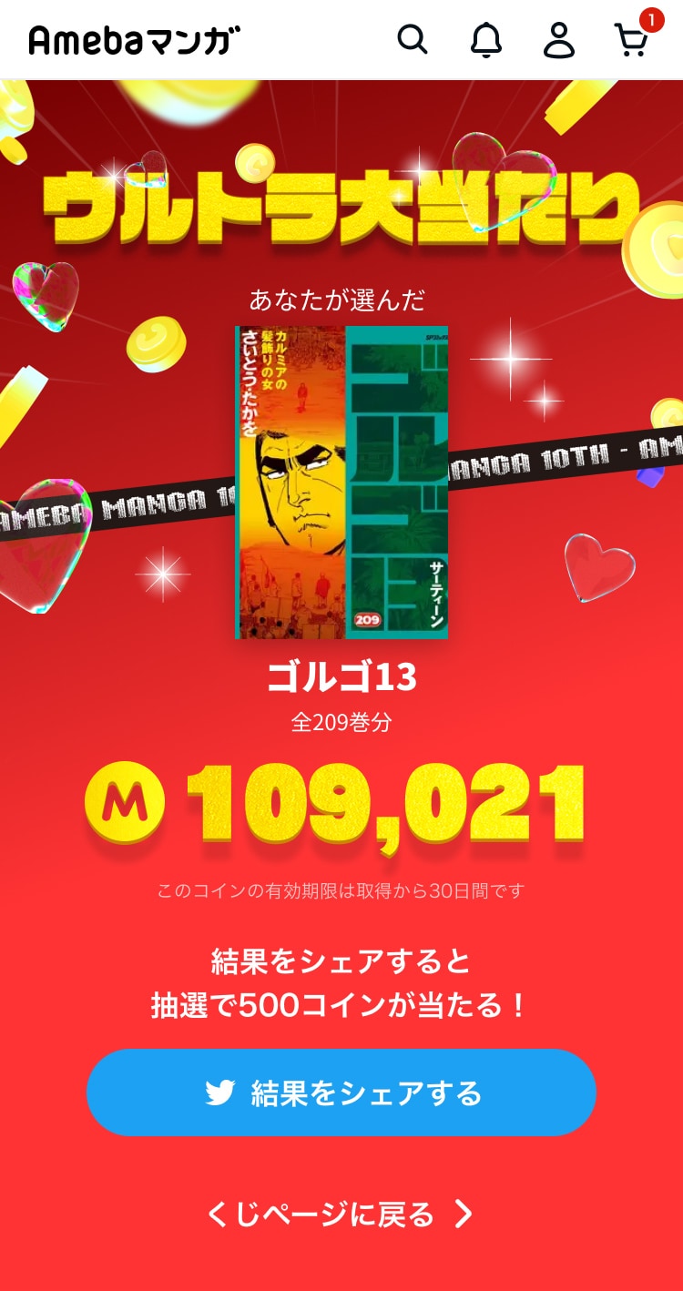 くじはマンガを購入するたびに引くことが可能で、「ウルトラ大当たり」が引ける確率は40回に1回。なおAmebaマンガにはマンガの購入に使えるコインが特典としてお得にもらえる月額プランが存在しており、3300円未満の月額プランに加入すると30回に1回の確率で、3300円以上の月額プランに加入すると20回に1回の確率で「ウルトラ大当たり」が引ける。