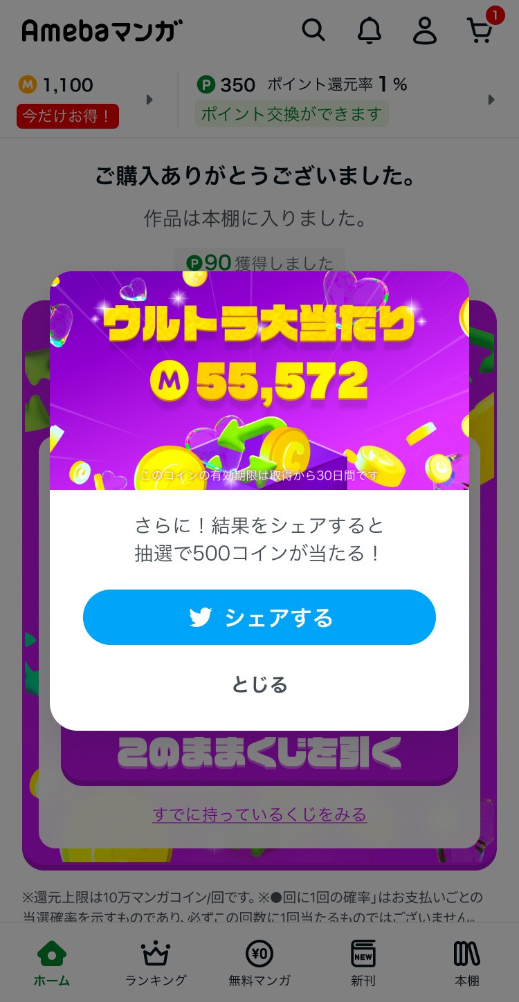 マンガ100冊分の50%還元クーポン - 「大当たり」