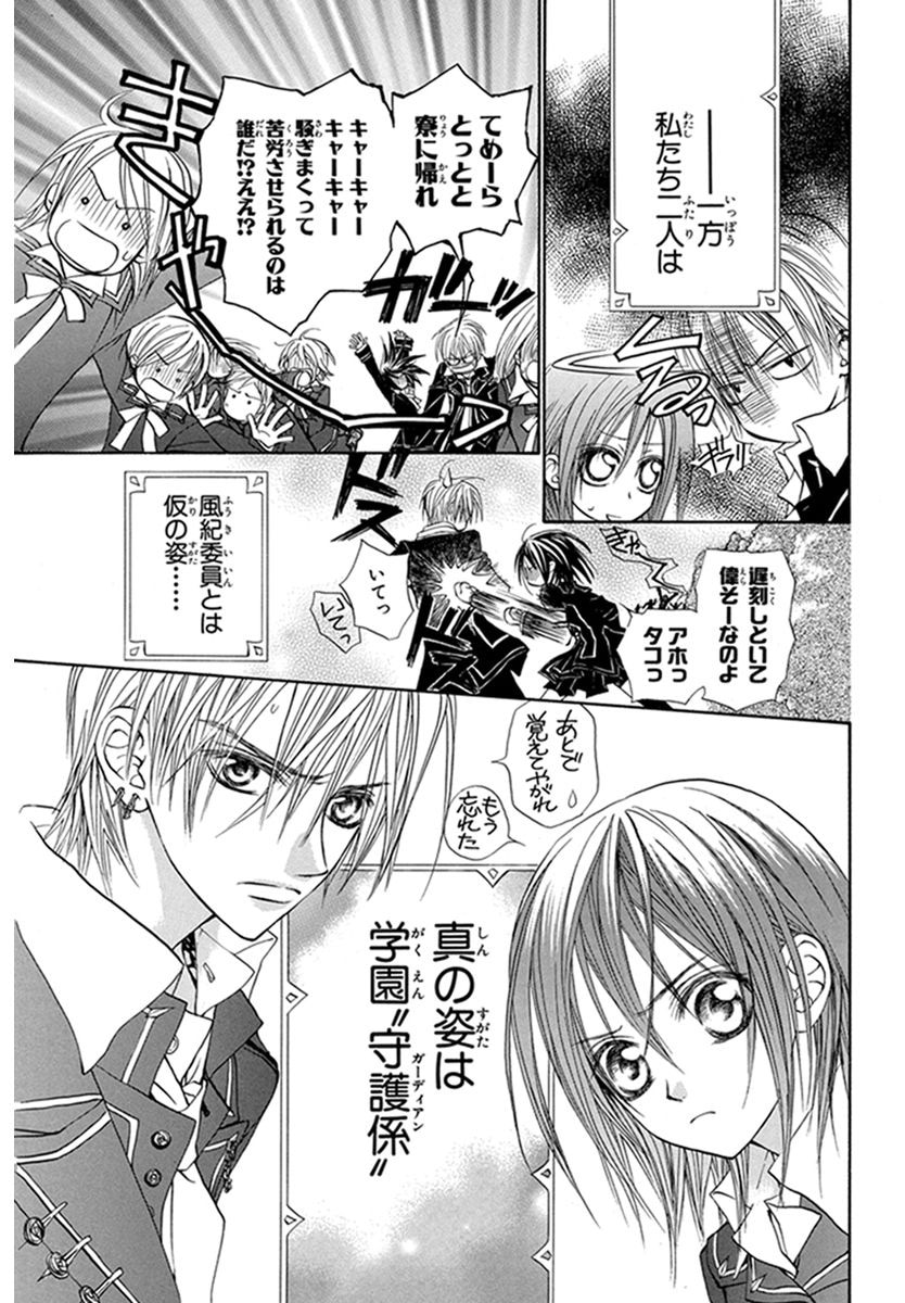 普通科の優姫と零は、夜間部の秘密を守る“守護係”として活動する日々を送る。 枢は夜間部の寮長を務める。 |