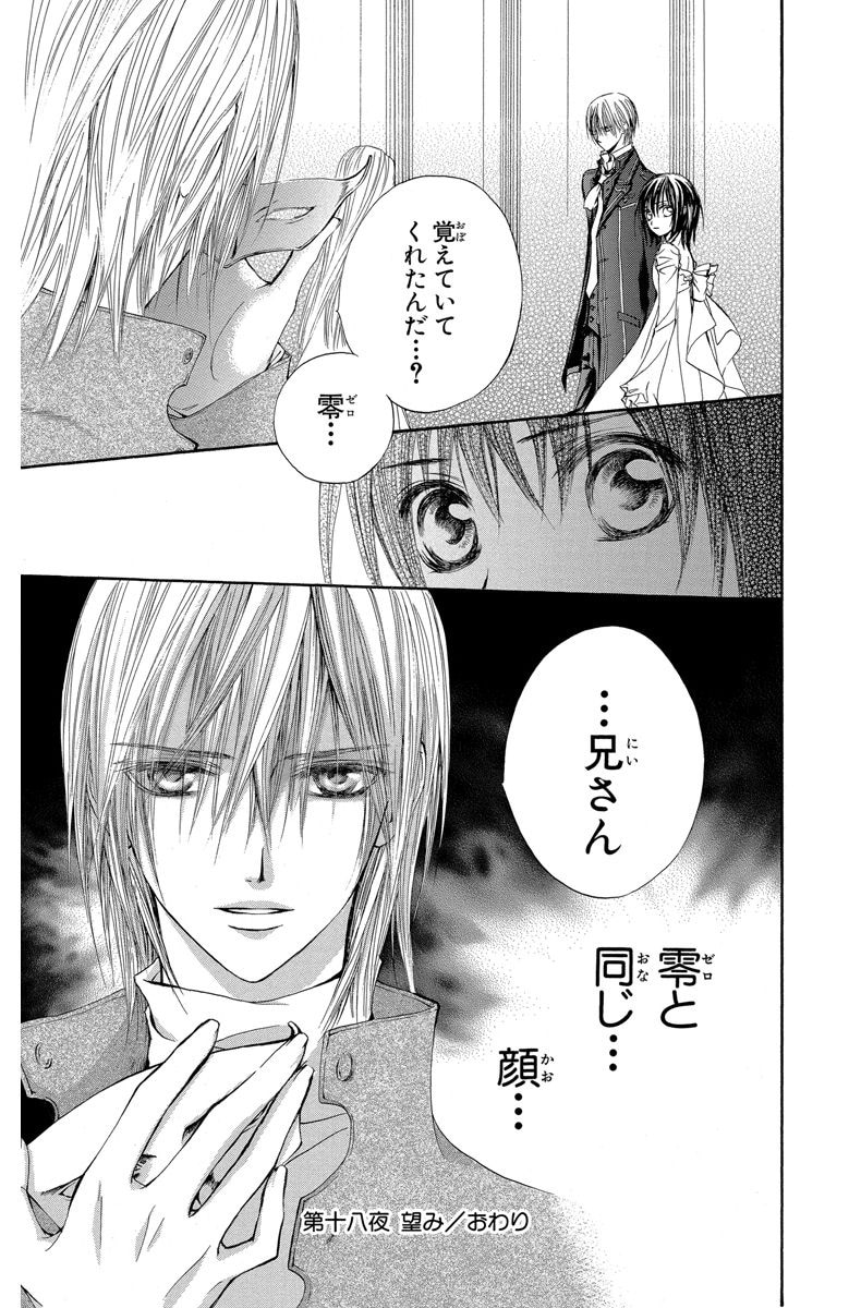 | 墓地で再会する零と優姫。純血種の吸血鬼・橙茉に襲われ気を失った優姫は、零の懐かしい匂いに惹かれ、無意識に血を吸おうとして……。 | |