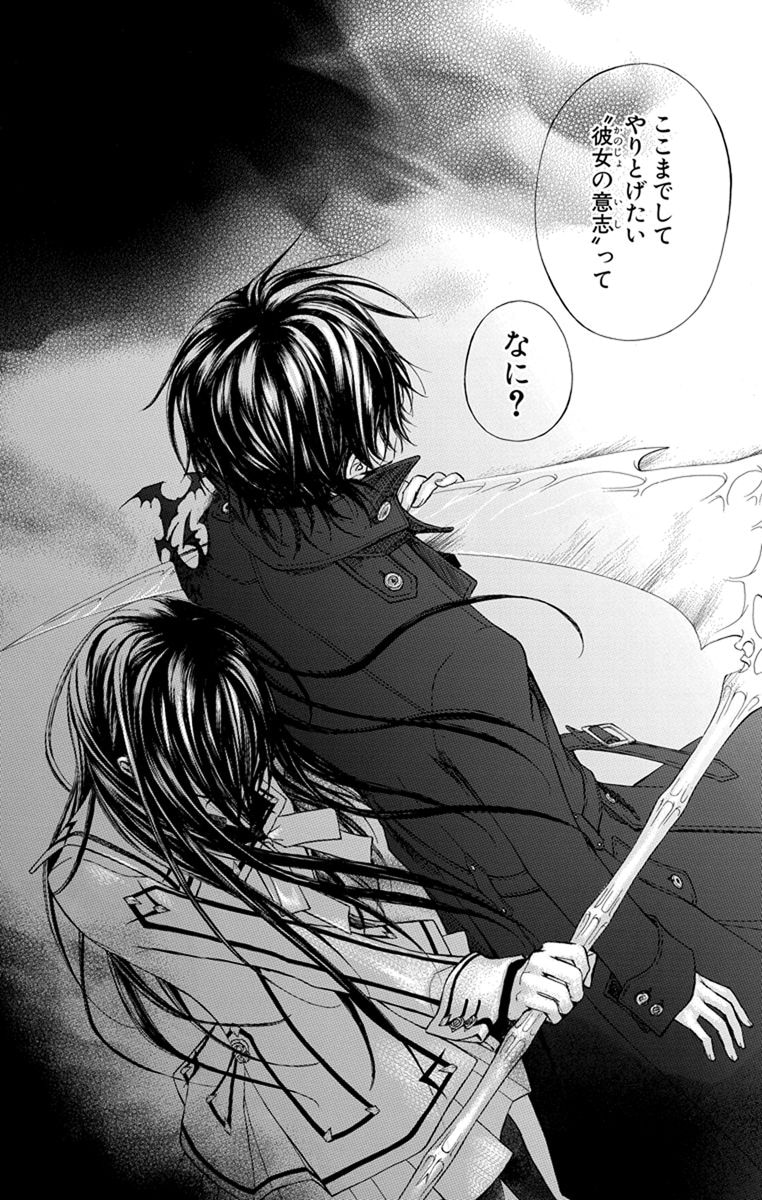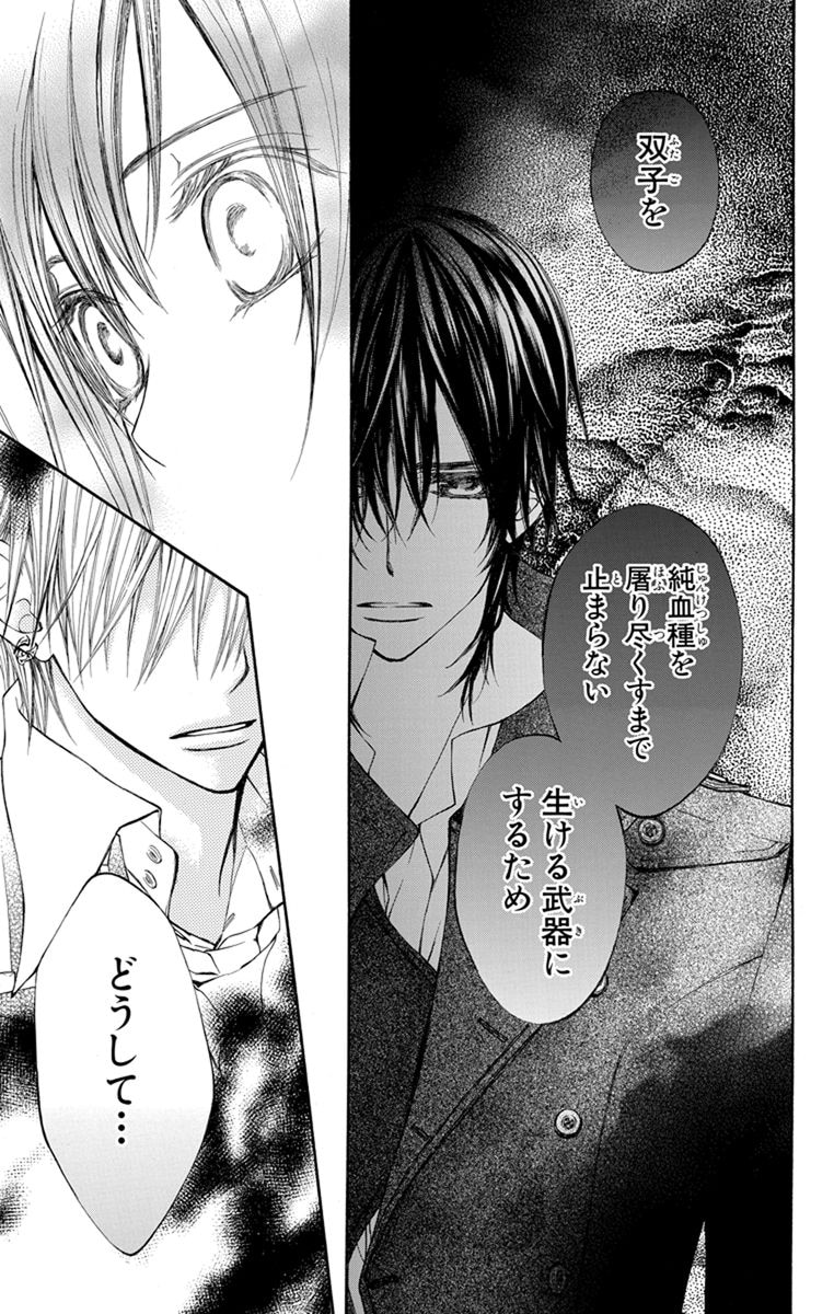 | 枢がかつて、囚われの身だった閑を解放し、錐生家を襲わせたことが判明。それは零と壱縷に純血種への憎しみを抱かせ、純血種殲滅のための“生ける武器”にするためだった。 | |