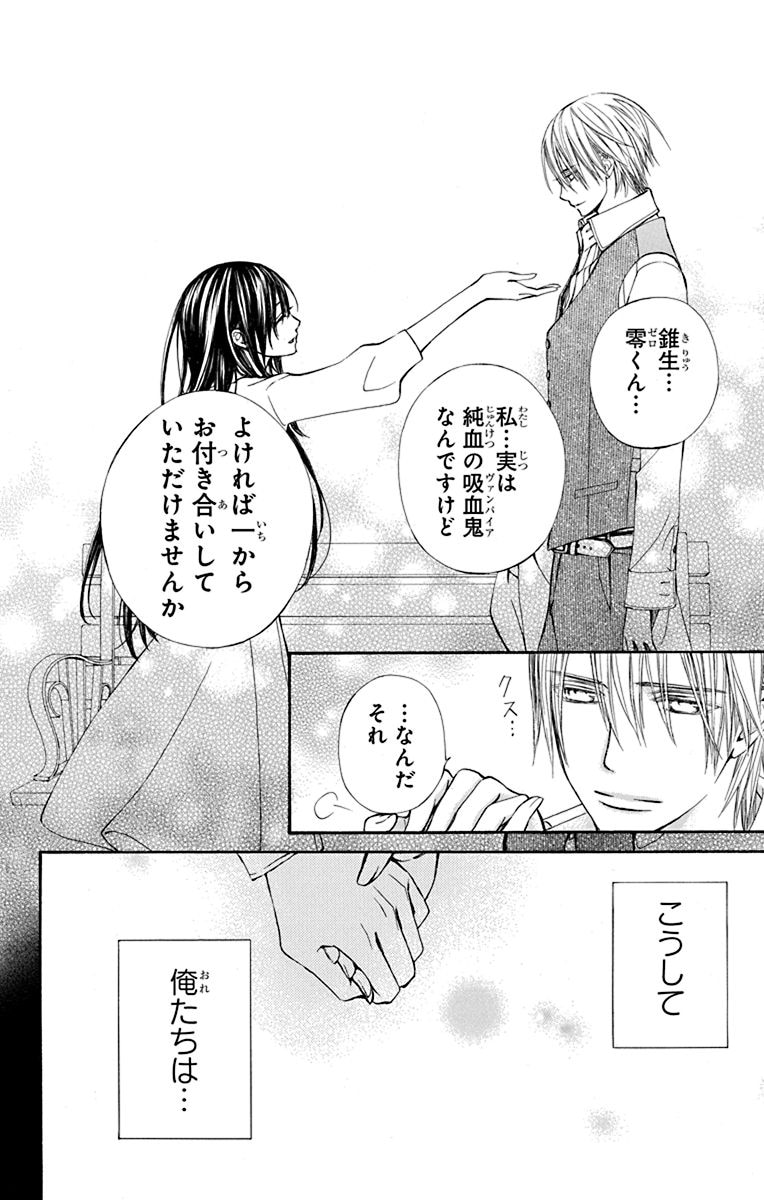 | “優姫を守る”という役割を全うさせるため、枢は自らの血を零に与える。 | |