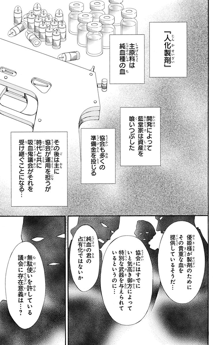 | 藍堂、枢が行っていた「吸血鬼を人間にする研究」を発見。後を引き継ぐことに。 | |