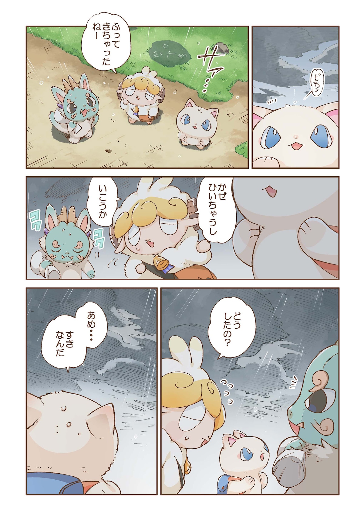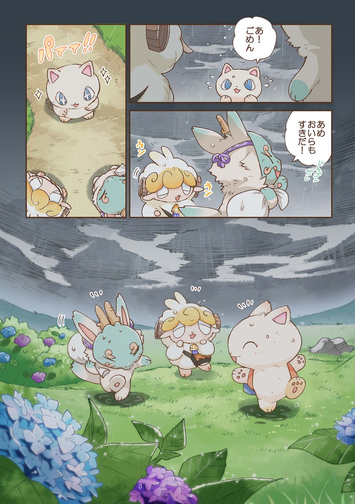 みきた わかります。私が特に好きなエピソードは42話と43話。雨が降ってきて、モフさんが「かぜひいちゃうし いこうか」と促すのですが、ネウは雨が好きで立ち止まり、結局3人で一緒に遊び始めてしまう。そのはしゃいでいる様子がすごく優しい空間で、大好きなシーンですね。