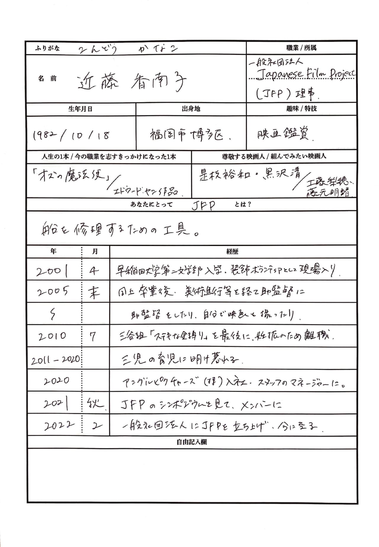 第13回では、Japanese Film Project(JFP)で理事を務める近藤香南子に取材を実施した。JFPは、日本映画業界の「ジェンダーギャップ・労働環境・若手人材不足」を検証し、課題解決するために調査および提言を行う非営利型の一般社団法人。近藤は助監督として映画の制作現場で働いていた経験を生かし、現在JFPメンバーの一員として活動している。セカンドキャリアとして、新たなフィールドで映画業界を支える近藤。彼女がこれまで歩んできた道のりと、その情熱に迫った。