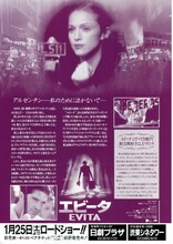解説 世界的な大ヒット・ミュージカルを映画化したスケール感豊かなミュージカル・ドラマ。舞台脚本をA・パーカーが脚色。その映画用台本に合わせて、A・L・ウェバーと主要キャストが5週間かけて音楽の再録音に臨んだ。その結果仕上がった映画は、90%がミュージカル・シーンで埋め尽くされ、ダイナミックな映像の中に、33歳で世を去った伝説の女性エバ・ペロンをうたい上げるゴージャスな人間ドラマとなった。物語は不遇の少女時代から始まり、タンゴ歌手、会社社長らの愛人生活を経て、社交界で知り合った陸軍大佐ホアン・ペロンとともに政界を支配。大統領夫人として国民に親しまれながらも、病に倒れていくまでを、A・バンデラス扮する狂言回しチェの語りの中に描いていく。1920~50年代の文化を再現した衣装、美術セットは実に豪華。4000人のアルゼンチン人エキストラを前に、マドンナが主題歌『ドント・クライ・フォー・ミー・アルゼンチーナ』を熱唱する場面も見ものだ。