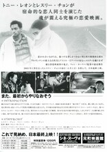 解説 「天使の涙」に続く、香港映画界の雄ウォン・カーウァイの監督作。南米を舞台にした、愛し合うふたりの男の葛藤。前作のイメージを一新する、意欲に満ちた斬新な演出が見逃せない。