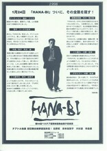 HANA-BI ハナビ 1998年1月24日(土)公開 / 上映時間:103分 / 製作:1997年(日本) / 配給:オフィス北野=ヘラルド=バンダイビジュアル=TOKYO FM=テレビ東京 概要 配信情報 画像 動画 ニュース 監督の関連作品 出演者の関連作品 オススメ作品 関連商品 あらすじ・ストーリー 刑事の西は銃撃を受けた部下たちの死や重傷に茫然。折りしも、西の入院中の妻が余命少ないことも判明する。辞職した西はヤクザから金を借りて妻と最後の旅に出るが……。 解説 周囲の者の死を受け入れていく男の決意を描いた、北野武の監督作品。暴力と乾いた笑い、詩情や哀切さなどのエッセンスが込められた物語は、北野作品の集大成といえそうだ。 情報提供:ぴあ スタッフ 監督:北野武 音楽:久石譲 キャスト 西の妻:岸本加世子 堀部:大杉漣 中村:寺島進 ボディガード・東城:白竜 スクラップ工場の親父:渡辺哲 西:ビートたけし 凶悪犯:薬師寺保栄 取調べを受ける男:津田寛治 受賞歴 第54回ヴェネツィア国際映画祭 コンペティション部門 金獅子賞 上映スケジュール 近くの映画館 上映スケジュールがありません さらに読み込む より詳しい検索はこちら