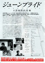 ジューンブライド 6月19日の花嫁 ジューンブライドロクガツジュウクニチノハナヨメ 1998年6月13日(土)公開 / 上映時間:108分 / 製作:1998年(日本) / 配給:松竹 概要 画像 監督の関連作品 出演者の関連作品 あらすじ・ストーリー 結婚を1週間後に控えた女性、千尋が記憶を失った。原因は交通事故らしいが、それも不確か。かすかな記憶を頼りに自分の“過去“をたどる千尋は、やがて意外な事実を知る。 解説 「ドリーム・スタジアム」の大森一樹によるサスペンス。記憶を失った女性の“過去“の捜索をミステリアスに描く。せつなさを高めるラブソングの名曲『STILL』が印象的。 情報提供:ぴあ スタッフ 監督:大森一樹 キャスト 富田靖子 椎名桔平 野村宏伸 保坂尚輝 本宮泰風 橋龍吾 南野陽子 PENICILLIN 篠原涼子 寺脇康文 全て表示 斉藤洋介 上映スケジュール 近くの映画館 上映スケジュールがありません さらに読み込む より詳しい検索はこちら
