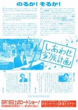 しあわせ家族計画 シアワセカゾクケイカク 2000年9月16日(土)公開 / 上映時間:100分 / 製作:2000年(日本) / 配給:松竹 概要 配信情報 画像 監督の関連作品 出演者の関連作品 あらすじ・ストーリー 家族4人で幸せに暮らす川尻一家。ところが夫の富士夫が突然リストラに。社宅を追い出され、一家が妻の実家に転がり込むと、そこに『しあわせ家族計画』出場の知らせが届く。 解説 現在も放映中の人気TV『しあわせ家族計画』を物語の背景に、家族の絆を描写。リストラされた中年の父親が、『しあわせ…』で出された難題をクリアするために大奮闘する。 情報提供:ぴあ スタッフ 監督:阿部勉 キャスト 三浦友和 渡辺えり子 片岡鶴太郎 名取裕子 野際陽子 いかりや長介 平山綾 佐々木和徳 小栗旬 阿部寛 全て表示 冨士眞奈美 吉村明宏 向井亜紀 徳井優 大竹しのぶ 鶴田忍 柳沢慎吾 笹野高史 小林稔侍 上映スケジュール 近くの映画館 上映スケジュールがありません さらに読み込む より詳しい検索はこちら