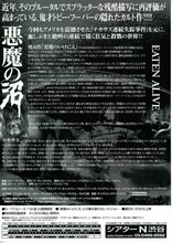 悪魔の沼 アクマノヌマDEATH TRAP 製作:1976年(米) 概要 配信情報 画像 監督の関連作品 出演者の関連作品 関連商品 解説 「悪魔のいけにえ」の成功で、フーパーがハリウッドに招かれて撮った第2作。これも実話に基づいている。テキサスで連続失踪事件が発生した。捜査に当たった警察は、ワニの飼われている池で、髪や肉片を発見。狂人が、旅行者の首を大鎌ではね、捨てていたのだ……。 情報提供:ぴあ スタッフ 監督:トビー・フーパー 音楽:トビー・フーパー キャスト メル・フェラー ネヴィル・ブランド マリリン・ヴァンス 上映スケジュール 近くの映画館 上映スケジュールがありません さらに読み込む より詳しい検索はこちら