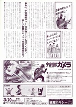 宇宙怪獣ガメラ ウチュウカイジュウガメラ 上映時間:92分 / 製作:1980年(日本) / 配給:大映 概要 配信情報 画像 ニュース シリーズ関連作品 監督の関連作品 出演者の関連作品 オススメ作品 解説 地球征服をたくらむ宇宙海賊・ザノンが次々と送り込む怪獣を、平和星M38から派遣された3人の宇宙人が、ガメラを呼んで撃退する。“ガメラ”シリーズ全7作から、ガメラと怪獣たちの戦闘シーンをピック・アップしたアンソロジー。 情報提供:ぴあ スタッフ 監督:湯浅憲明 キャスト キララ:マッハ文朱 小島八重子 上映スケジュール 近くの映画館 上映スケジュールがありません さらに読み込む より詳しい検索はこちら