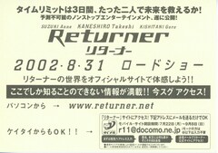 2002年8月31日(土)公開 / 上映時間:118分 / 製作:2002年(日本) / 配給:東宝=ROBOT=フジテレビジョン=「Returner リターナー」フィルムパートナーズ=アミューズピクチャーズ=イマジカ=白組
