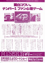 ミザリー ミザリーMISERY 上映時間:108分 / 製作:1990年(米) 配信情報 画像 ニュース 監督の関連作品 出演者の関連作品 オススメ作品 関連商品 情報提供:ぴあ スタッフ 監督:ロブ・ライナー 原作:スティーヴン・キング キャスト ジェームズ・カーン キャシー・ベイツ リチャード・ファーンズワース ローレン・バコール 受賞歴 第63回アカデミー賞 主演女優賞 第48回ゴールデングローブ賞 ドラマ部門 主演女優賞 上映スケジュール 近くの映画館 上映スケジュールがありません さらに読み込む より詳しい検索はこちら