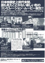 Jam Films ジャムフィルムズ 2002年12月28日(土)公開 / 上映時間:109分 / 製作:2002年(日本) / 配給:アミューズ=セガ 配信情報 画像 監督の関連作品 出演者の関連作品 あらすじ・ストーリー 7人の監督が15分前後の短編を競作するオムニバス作品。岩井俊ニはCGファンタジー、堤幸彦は一幕コント、行定勲は青春映画、篠原哲雄はラブ・ストーリーとバラエティ色豊かな内容。各監督と個性派俳優陣によるコラボレーションも注目だ。 情報提供:ぴあ スタッフ 原作:飯田譲治 監督:飯田譲治 音楽:岩井俊二 監督:岩井俊二 監督:望月六郎 監督:行定勲 監督:北村龍平 監督:篠原哲雄 監督:堤幸彦 監督:原田大三郎 キャスト 北村一輝 魚谷佳苗 坂口拓 山崎まさよし 篠原涼子 山田幸伸 氏家恵 あがた森魚 大沢たかお 角田ともみ 全て表示 筒井康隆 ティーシャ サムエル・ポップ メクダシ・カリル アルバート・スミス 吉本多香美 篠原さとし 麿赤兒 小柳正貴 飛岡さや 佐々木蔵之介 秋山菜津子 高橋愛 妻夫木聡 綾瀬はるか クリスチャン・ストームズ 新井浩文 三浦哲郁 福井裕佳梨 栗原瞳 広末涼子 上映スケジュール 近くの映画館 上映スケジュールがありません さらに読み込む より詳しい検索はこちら