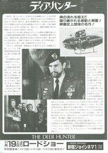 解説 1968年、ペンシルバニア州の小さな工場で働く5人の若者たちは、休みの日には鹿狩りをする仲間だった。5人のうち、マイケル、ニック、スティーブンの3人が徴兵されてベトナムへ行く。1970年、ベトナムでマイケルはニックとスティーブンと偶然再会するが、3人は北ベトナム軍の捕虜となり、小屋につながれてしまう。その小屋では捕虜に対してロシアン・ルーレットが強要され、ベトナム兵たちが賭けていた。3人の順番が来た時、スティーブンが発狂寸前となり、マイケルは一瞬のスキを狙い、銃を奪い逃走。3人はどうにか助けられるが、バラバラになってしまう。2年後、マイケルは故郷に帰ってくるが、以前の明るさは消えていた。ニックがベトナムで生きていることを知ったマイケルは、ベトナムに飛ぶ。ベトナムで発見されたニックは、ロシアン・ルーレットの撃ち手をしており、意識は朦朧としていた……。ベトナム戦争がもたらした狂気をリアルに描き出している。