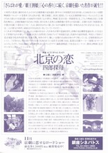 解説 京劇を学ぶ日本人女性と京劇俳優の中国人男性の恋物語と、そこに差し込む日中両国の歴史の影を描くことで両国の未来を探る問題作。『北京バイオリン』の脚本家が京劇の演目『四郎母探』をモチーフに国境を越えて求め合う恋人たちを描く。テレビ『中国語会話』に出演中の女優、前田知恵とテレビドラマで活躍する若手チン・トンが主演を担当する。