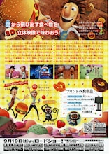 あらすじ・ストーリー 発明家のフリントが、コップ一杯の水で食べ物ができるマシーンを発明。ところが不慮の事故によりマシーンは雲の彼方へ。やがて、空からホットドッグやパンケーキなど、おいしい食べ物が降ってくるようになる。