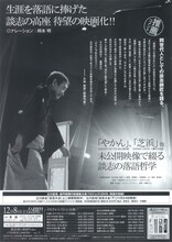 あらすじ・ストーリー 映画は、2011年11月に惜しくもこの世を去った立川談志の高座の中から『芝浜』と『やかん』の模様を収録。さらにこれまで公開されてこなかった談志の生前の姿を伝えるドキュメンタリー映像を交えて、立川談志の落語や人生に対する哲学を描き出していく。