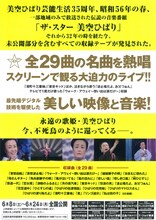 解説 昭和50年代に一部地域のみで放送されていたTV番組『ザ・スター』。その放送初回から5週にわたり出演したスター、美空ひばりの映像をスクリーンで上映。倉庫で30年以上眠り続けていたテープを完全に復元し、放送未公開の貴重な映像も収録。『リンゴ追分』や『東京キッド』『悲しい酒』など、ひばりの代表曲の数々全29曲が映し出される。
