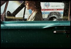LA DAME DANS L'AUTO AVEC DES LUNETTES ET UN FUSIL