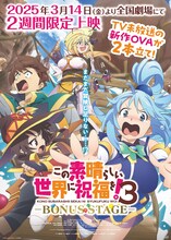 解説 2024年に放送された、『この素晴らしい世界に祝福を!3』のTV未放送のOVAを2本立てで上映する。暁なつめの原作を基に、交通事故が原因で異世界に勇者として転生したひきこもりのカズマが、個性豊かな仲間たちと繰り広げる冒険をコメディタッチで描く。監督は安部祐二郎。声の出演は福島潤、雨宮天、高橋李依、茅野愛衣、原紗友里ら。