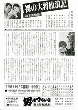 裸の大将放浪記 ―山下清物語― ハダカノタイショウホウロウキ-ヤマシタキヨシモノガタリ- 上映時間:117分 / 製作:1981年(日本) / 配給:現代ぷろだくしょん 概要 画像 監督の関連作品 出演者の関連作品 解説 精薄の天才画家・山下清の生涯を、新たに編集された清の日記をもとに描いた作品。乱暴な子として施設に入れられ、そこで絵の才能を開花させた話や、気ままな生活に憧れて旅に出ていくエピソードなど、興味深い内容が淡々とした映像で綴られていく。 情報提供:ぴあ スタッフ 監督:山田典吾 原作:山下清 音楽:渋谷毅 キャスト 芦屋雁之助 南沢一郎 根上淳 磯村みどり 中村玉緒 上映スケジュール 近くの映画館 上映スケジュールがありません さらに読み込む より詳しい検索はこちら