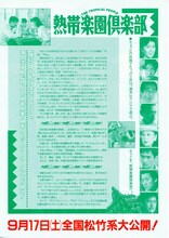 熱帯楽園倶楽部 THE TROPICAL PEOPLE ネッタイラクエンクラブザトロピカルピープル 上映時間:104分 / 製作:1994年(日本) / 配給:松竹=ポニーキャニオン 概要 配信情報 画像 監督の関連作品 出演者の関連作品 解説 「僕らはみんな生きている」の監督・脚本・撮影のトリオが再び結集、すべてタイ・ロケで行われた詐欺師コメディ。バンコクで添乗員をしている紺野みすずは、日本人相手のセコい詐欺師コンビ、飛田林&ジョイと知り合う。ところが他人のミスで会社から大目玉を食らった彼女が二人に急接近、奇妙な三角関係になって……。ロケ効果を活かしたエキゾチックなタイの雰囲気と、“肩の力を抜いた演技“が楽しい。 情報提供:ぴあ スタッフ 監督:滝田洋二郎 キャスト 清水美砂 萩原聖人 風間杜夫 白竜 岸部一徳 藤田敏八 久里千春 上映スケジュール 近くの映画館 上映スケジュールがありません さらに読み込む より詳しい検索はこちら