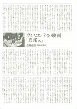 解説 平凡な市民のムルソーは、母の死も恋人との情事もまったく現実として受けとめることができない。ただそこにいることだけが真実だった彼は、太陽がまぶしいという理由で人を射ち殺す……。カミュの有名な実存主義文学を映画化しようとしたヴィスコンティの野心的な試みだが、決して成功したとはいえないだろう。しかし、A・カリーナは印象的だ。