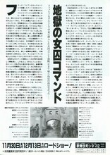 地獄の女囚コマンド ジゴクノジョシュウコマンド 上映時間:97分 / 製作:1990年(米) 概要 配信情報 画像 出演者の関連作品 解説 中東の独裁国家サイブラに捕らわれている革命派リーダーの救出を依頼された元コマンドのライアン。さっそく彼は各地の屈強の囚人や元殺し屋といった女ばかり6人をスカウト。サイブラに侵入した彼らは、無事独裁者バルトスに近づくが、実は仕事の依頼者が裏切り者だと知って……。B級ながら大がかりなアクションと豪華なキャストが魅力。 情報提供:ぴあ スタッフ 監督:ピーター・レーダー 監督:ニコ・マストラキス キャスト ブライアン・トンプソン ジョージ・ケネディ ミシェル・モフェット オリヴァー・リード ホセ・フェラー 上映スケジュール 近くの映画館 上映スケジュールがありません さらに読み込む より詳しい検索はこちら