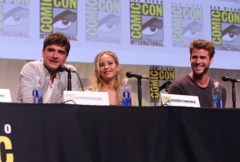 プレゼンテーションに参加したのは、ジェニファー、ヘムズワース、ハッチャーソン、シールズ、監督のローレンスら。会見への参加が1年ぶりというジェニファーが質問にうまく答えられずにいると、会場に集まった約6500人のファンから「I LOVE YOU JENNIFER」と声援が送られる場面も。ヘムズワースは、自身が演じるゲイルとハッチャーソン扮するピータ、そしてジェニファーが演じるカットニスの三角関係に話題が及ぶと、「ゲイルとピータにはキスシーンがあるかも」とコメントして会場を沸かせた。