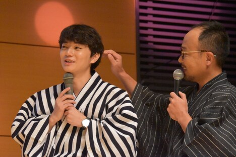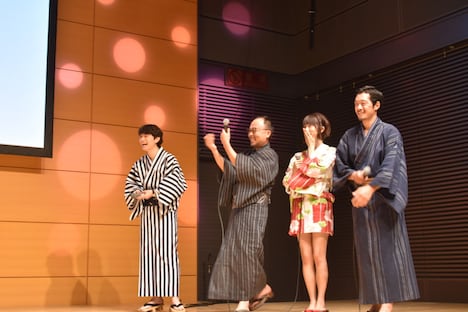 キャスト陣はステージに浴衣姿で登場。真野と小島の浴衣の丈が短いことに気づいたマキタは、登壇早々自分の浴衣を同じ丈までたくしあげる。真野が「こんなに丈の短い浴衣は初めてなんですが、マキタさんも同じだと思うと安心しました」と話すと、マキタはすかさず「俺はノーパンだけどね。ここぞというときのために」と返し笑いを誘う。
