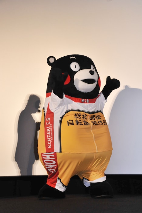 舞台挨拶ではサプライズゲストとして、映画の舞台・熊本県にちなみ劇中にも登場しているくまモンがロードバイクに乗って会場に現れる一幕も。最後にメッセージを求められた巻島裕介役の森久保は「原作はまだ続いております。この先も『弱ペダ』にはドラマがあるんじゃないかと私は信じてます。『弱ペダ』に頂上(テッペン)をとらせてください」と述べて会場を沸かせる。続いて山下が「坂道くんも自分の可能性を見つけられたように、僕自身もこれから可能性を見つけてずっと走り続けていけたらいいな」と笑顔を見せ、舞台挨拶を締めた。