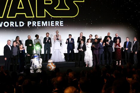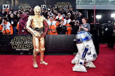 開催にあたり、ハリウッド大通りが4ブロックにわたって完全封鎖された本イベント。450mにおよぶレッドカーペットには同シリーズおなじみのドロイドコンビC-3POとR2-D2、本作より仲間入りしたドロイドBB-8、キャストの