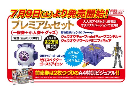このたび、一般券と小人券、そしてグッズがセットになったプレミアムセットの発売が7月9日に決定。歴代の仮面ライダーとスーパー戦隊が並ぶA4サイズの特別ビジュアル鑑賞券となっている。グッズはゼロスペクターゴーストアイコン、もしくはジュウオウキューブ mini キューブコンドルとジュウオウザワールドミニフィギュアのセットから選ぶことが可能だ。