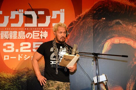 2015年に公開された「マッドマックス 怒りのデス・ロード」でも日本語吹替に挑んだ真壁。今回、2時間かかるはずの収録が1時間で終わったことを司会者が明かすと、さっきの謙虚な様子から一転、「俺をなめんなよ!と言いたい。前回よりスキルアップしてるから、よろしくね」とアピール。またキングコングと対決するなら?という話題では「俺だったらシェイクハンドした瞬間、目潰ししますね」と得意げに想像をふくらませたが、本作のキングコングが30mを超える大きさだと聞いて「届かねえじゃん! キングコングニードロップも高所恐怖症だから無理だよ。仲直りの握手だね」と恐れおののいた。
