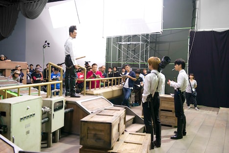 映像には、小学生の頃から週刊少年ジャンプを愛読し「銀魂」の大ファンだったという勘九郎が、作品について福田と熱く語り合う姿が捉えられた。さらにマヨラー・土方役の柳楽が、マヨネーズ型ライターや特製マヨネーズ丼“土方スペシャル”を手にする姿も。吉沢がバズーカを放つ撮影風景も収められている。終盤では、「真選組にお任せあれ」というセリフを言おうとした勘九郎が、志村妙役の