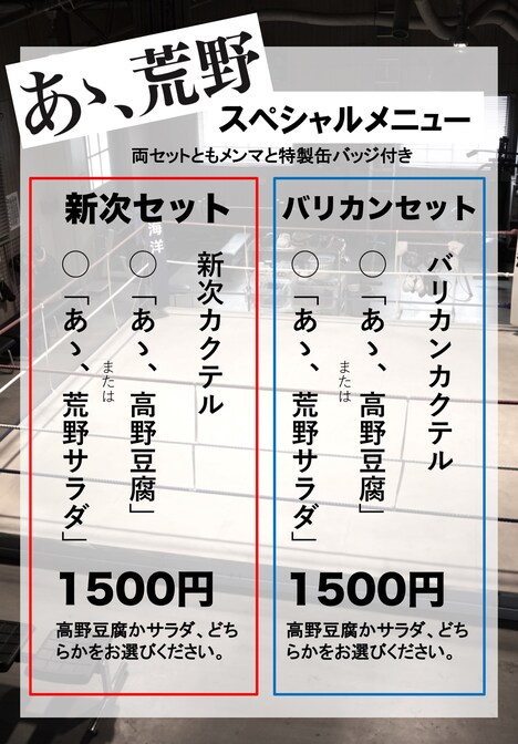 バー荒野は、同地の飲食店Greyが、明日10月7日から11月2日までの期間限定で姿を変えるもので、期間中は缶バッジ付きの特別メニュー2種が登場。各1500円のこのメニューでは、“あゝ、高野豆腐”もしくは“あゝ、荒野サラダ”のうちどちらか一品と、新次とバリカンそれぞれのイメージカラーのカクテル、メンマが楽しめる。なおアルコールが苦手な人にはカクテルの代わりに“あゝ、コーラ”が提供される。