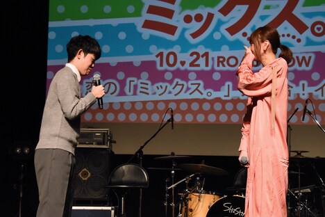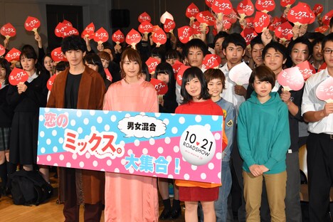 「男女混合 恋のミックス。大集合」と題した本日のイベントには、登壇者たちを一目見ようと多くの高校生が駆け付けた。新垣と瑛太が姿を現すと場内に割れんばかりの歓声が響き渡り、「ヤバい! ヤバい!」など興奮した高校生たちの声が飛び交う。「ほら、笑ってる」を普段から繰り返し聴いているという新垣は、SHISHAMOのライブに感動したようで「まさか生で聴ける機会をいただけるとは思わなかったです。素敵でした」と述懐。瑛太は「さっき入ってきたとき誰も『瑛太』って言わなかったね。『ガッキー!』しか聞こえなかった」と観客の笑いを誘い、SHISHAMOについて「3人のグルーブ感が最高でした。曲も映画にすごくマッチしていて感動しました」と語った。