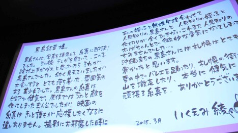 ここでキャストの3人へのサプライズとして、原作者・いくえみからの手紙が到着。スクリーンに映し出された1人ひとりへ向けた直筆のメッセージに、3人は驚きながらも笑顔で見入った。「札幌の街や山を激走したり、本当に健気に頑張る糸真をありがとうございました」というコメントに、黒島は「ゆっくりお話できなかったのですが、こんなに見ていただけていたなんて」と感激する。いくえみからの「撮影の合間に1人でクルっと回ってるのを見た」というメッセージに対して小瀧は、「見られてたと思うと恥ずかしいけどうれしい。無意識にやってました。事務所がジャニーズなんで、すみません(笑)」とさわやかに言い放ち、笑いを誘う。高杉は「まだ撮影前の素の高杉くんがまるきり和央だったので、どびっくりいたしました」という称賛を受け、「僕も“どびっくり”しました。先生にそこまで言っていただけると、がんばらなきゃなって思います」と真摯に述べた。