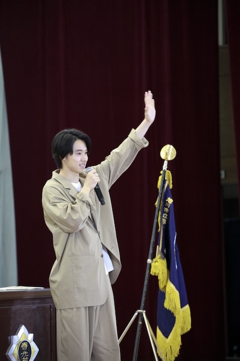 最後に山崎は卒業生に向け「とにかくいろんなことに挑戦してみてください。そして好きなことを見つけたら、とことん力を注いで、地道に“コツコツ”とやっていけば、それが夢や仕事にもつながると思います」と劇中のセリフを引用してエールを送る。また「僕が演じた外村も高校2年生のときに調律師という仕事に魅力を感じて、目指すことになるのですが、やっぱり最初は失敗ばかりでうまくいかない。でも外村は、調律という仕事が好きで、あきらめずにコツコツがんばり続けるんです。これから新しい生活を迎える皆さんの背中をそっと後押ししてくれる作品になっていますので、ぜひ観てもらえるとうれしいです」と作品をアピール。退場時に山崎は、全校生徒が自主的に作った花道を通り、ハイタッチを交わしながら体育館をあとにした。