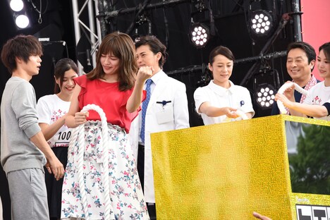 灰色のスウェットを着た窪田をはじめ、劇中衣装で登場したキャスト陣。窪田は猛暑の中屋外で行われたイベントに集まったファンを気遣い「皆さん水分補給してますかー」と呼びかける。そして「貴重な日曜日をこの『ヒモメン』のために……。今日は短い時間ですが楽しんでください」と挨拶。ヒモと生活することについて「ペットを飼ってる感覚?なのかなと思います。女性が活躍していく時代なのでヒモのような男性が増えてもいい」と持論を展開し、役作りに関しては「(ヒモに)なり切るのは難しいです。自分にとって演じることが仕事なので」と笑みをこぼした。