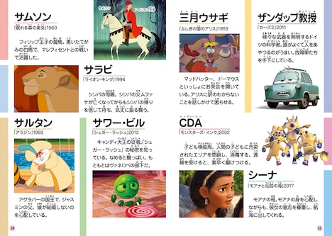 本書は、ディズニー映画に登場する500以上のサブキャラクターを集めたもの。「眠れる森の美女」のフィリップ王子の愛馬・サムソン、「ライオン・キング」のシンバの母・サラビ、「アラジン」に登場するアグラバーの国王でジャスミンの父・サルタン、「ふしぎの国のアリス」の三月ウサギといったキャラクターたちが五十音順に掲載されている。