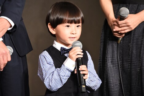 会見の後半には息子・翔太役の小岸洸琉くんも登壇。ひさしぶりの再会に井上は「やっぱり1年も経つと大きくなりますね。こんなに立派になって」と顔をほころばせながら洸琉くんの頭を撫でる。緊張して言葉が出ない様子の洸琉くんに妻夫木は「好きな食べものは?」と問いかけ、洸琉くんが「いちごです」と答える一幕も。現場では親子役の3人が一緒に過ごす時間も設けられ、3人で食事やピクニックもしたという。会見の最後には洸琉くんが2人に花束を手渡した。