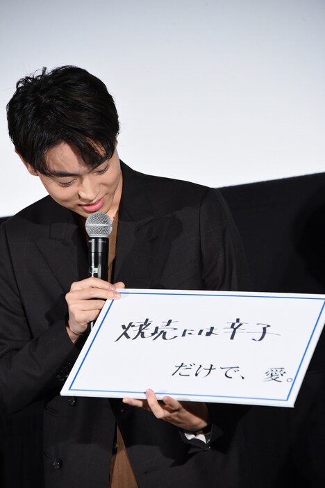 イベントではタイトルにちなみ、登壇陣が愛を感じることができるものを「◯◯だけで、愛。」とフリップで明かす場面も。「人と違うだけで、愛。」を出した関根が「みんなバラバラ、それでいいじゃん」と話すと、菅田は「そういうことかー。俺、間違えたな」とコーナーの趣旨を理解していなかった様子。麺類が大好きな西田の「すするだけで、愛。」というフリップには安心した顔を見せながら、菅田は「焼売には辛子だけで、愛。」と照れながら答える。最近、焼売に何を付けるか論争になったそうで「うちのマネージャーは塩。ほかにも醤油がいい人、ラー油がいい人もいて。俺は絶対に辛子だけ。焼売は人それぞれなんです」と堂々宣言。そのほか趣里は「おひとり様だけで、愛。」、仲は「健康だけで、愛。」と明かした。