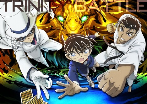 19世紀末に海底に沈んだとされる世界最大のブルーサファイア・紺青の拳を巡り、江戸川コナンと怪盗キッド、京極真の3人がシンガポールの巨大な陰謀に巻き込まれていく本作。ポスターには「真実VS奇術VS蹴撃 雌雄を決する三位一体(トリニティ)バトルミステリー」とコピーが添えられた。映画の鍵を握るブルーサファイアを持って真剣な表情を浮かべる工藤新一の姿も描かれている。あわせてコナンがパー、キッドがチョキ、京極がグーを出し、ジャンケンのあいこのように決着がつくことのない3人の関係性を表現したビジュアルも解禁された。