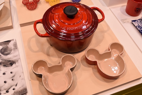 今年で10回目となる本展は、「ディズニー」「ピクサー」「スター・ウォーズ」「マーベル」の最新グッズを紹介する展示会。会場に入ってすぐの場所には、昨年でスクリーンデビューから90周年を迎えたミッキーマウスをはじめ、ミニーマウス、ドナルドダックにフォーカスした商品が展示された。また、ミッキーマウスがデザインされたル・クルーゼのココット、ドナルドダックのファミリーツリーをモチーフにしたバンダナ、ピンクと赤を基調にしたミニーマウスのファッションアイテムなどが並ぶ。