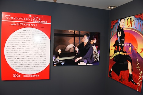 「KILIN・言葉の道」を抜けると、「KILIN・映画女優の部屋」「KILIN・日常の部屋」「KILIN・一個人の部屋」のコーナーを選択して進む。「KILIN・映画女優の部屋」では、鈴木清順監督の「ピストルオペラ」「ツィゴイネルワイゼン」や、河瀬直美がメガホンを取った主演作「あん」、山崎努と夫婦を演じた「モリのいる場所」、是枝裕和とタッグを組んだ「歩いても 歩いても」「海よりもまだ深く」「万引き家族」などを紹介。樹木が作品に寄せたコメントや、場面写真、メイキング写真が展示された。