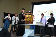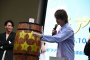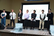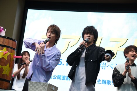 そして最後に8人で「全員で飛ばせ! ヒット祈願チャレンジ」という企画を実施。黒ひげ危機一発の要領で樽にナイフを刺していき、中央に仕込まれた“ヒット祈願の銀テープ”を誰が飛ばすことができるか、挑戦することに。横浜は自ら「流星! 流星!」とコールを起こしながらナイフを刺したほか、岩谷の番になると「アクロバティックに刺してよ」と無茶ぶり。全員が一巡したのち、中尾に「シューティングスター!」と呼ばれた横浜が2本目のナイフを刺したところ、見事銀テープが噴射された。不発だと思い込んだ横浜が後ろを向いた瞬間にテープが吹き出したことから、中尾は「(背後で火薬が爆発する)ヒーローみたいだった」と爆笑。“持ってる男”とはやし立てられた横浜は、そんなキャストたちの仲の良さについて「中尾は最初僕のこと『流星くん』って呼んでいたのに、1週間後には『おい流星!』になったからね。距離の詰め方がうまいんです(笑)」と話した。